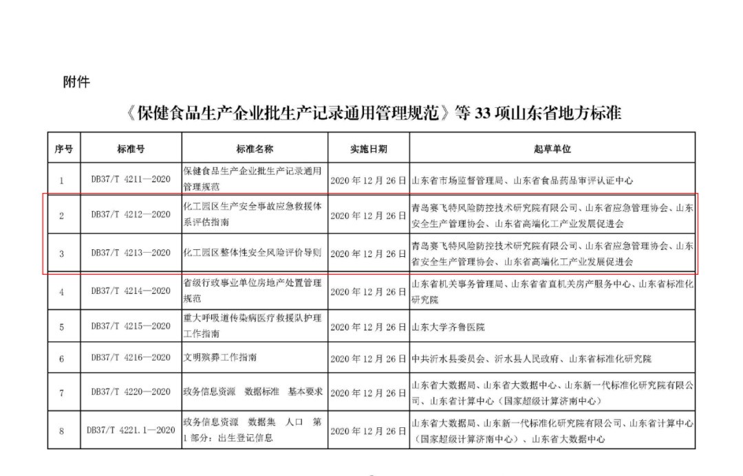 近日,山東省市場監(jiān)督管理局批準(zhǔn)發(fā)布了33項(xiàng)山東省地方標(biāo)準(zhǔn)。其中的《化工園區(qū)生產(chǎn)安全事故應(yīng)急救援體系評估指南》(DB37/T 4212-2020)、《化工園區(qū)整體性安全風(fēng)險(xiǎn)評價(jià)導(dǎo)則》(DB37/T 4213-2020)由青島賽飛特風(fēng)險(xiǎn)防控技術(shù)研究院有限公司、山東省應(yīng)急管理協(xié)會、山東省安全生產(chǎn)管理協(xié)會、山東省高端化工產(chǎn)業(yè)發(fā)展促進(jìn)會聯(lián)合起草,現(xiàn)分享給各位: