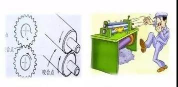對向旋轉(zhuǎn)部件的咬合處。如齒輪、軋鋼機(jī)、混合輥等。