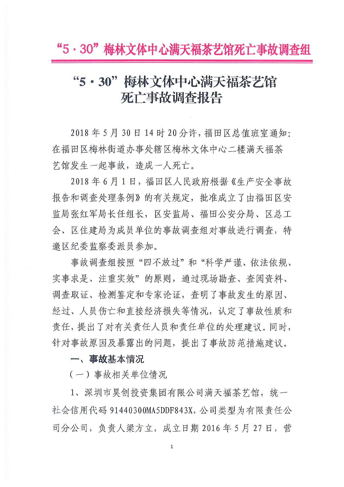 “5.30”梅林文體中心滿天福茶藝館死亡事故調(diào)查報(bào)告