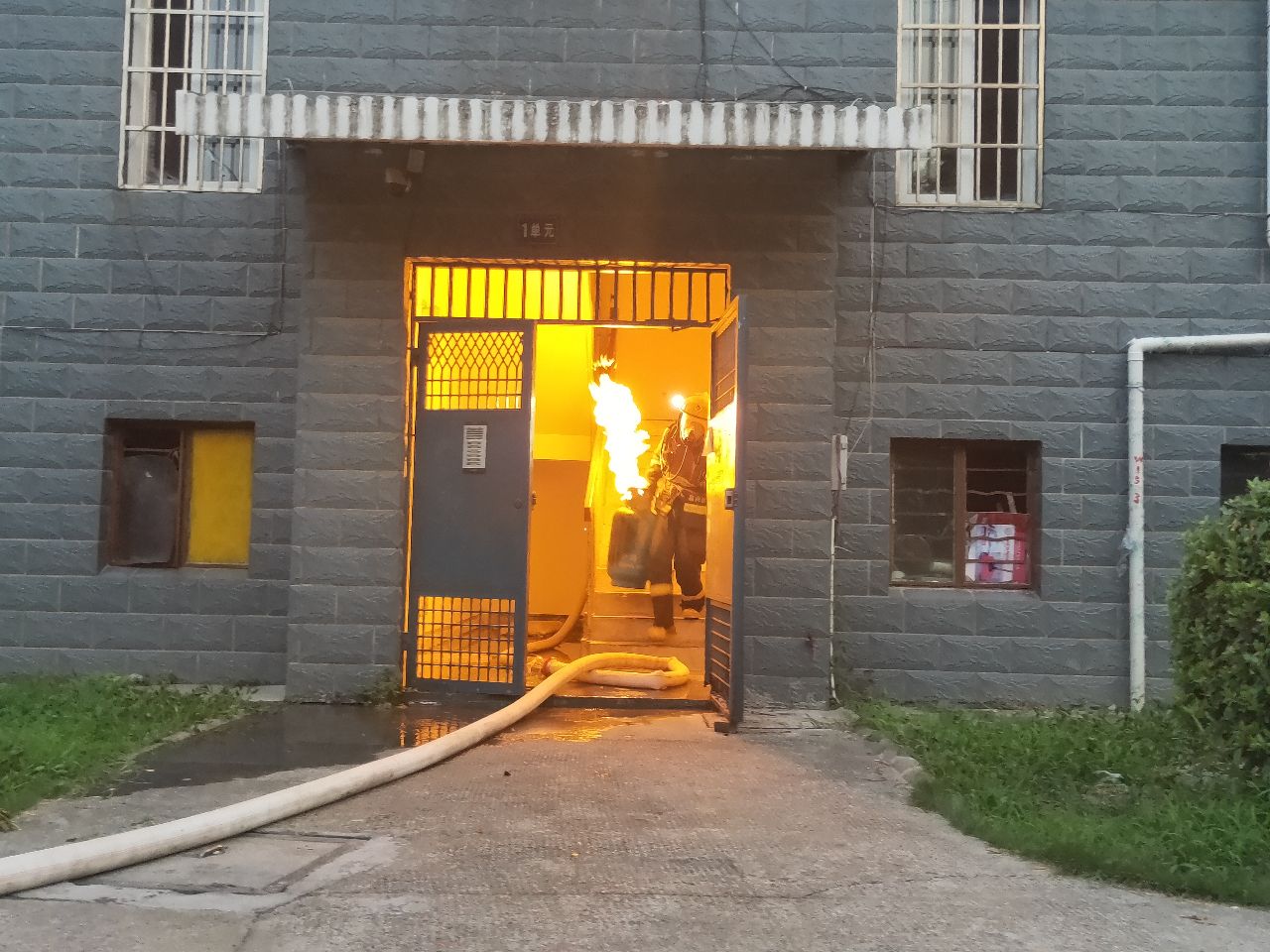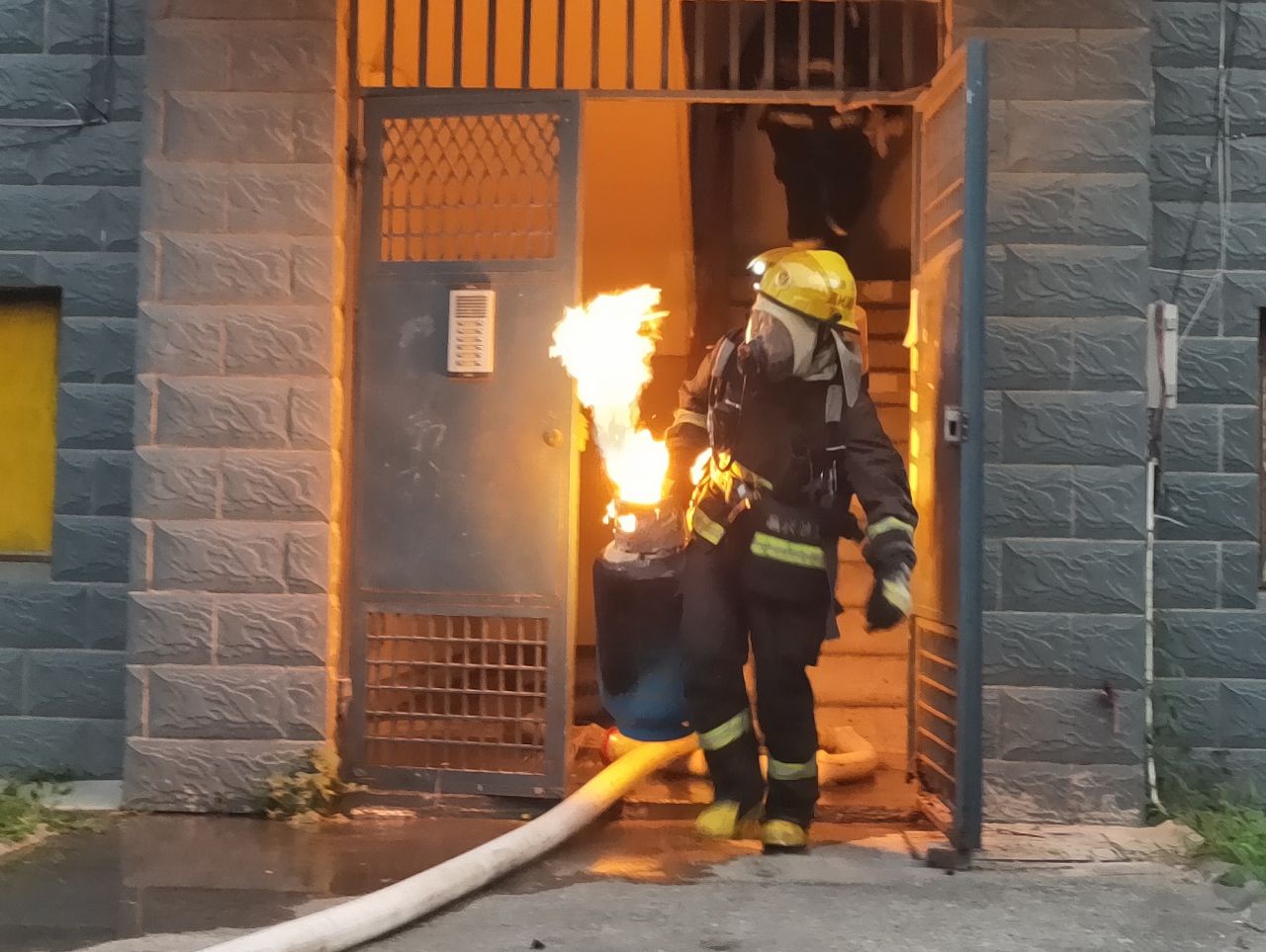 到達現(xiàn)場消防指戰(zhàn)員發(fā)現(xiàn),著火處物為煤氣罐,該煤氣罐位于居民房內廚房里,處于猛烈燃燒階段,隨時都有爆炸的可能,而且居民樓樓下都住有居民,一旦發(fā)生爆炸,后果不堪設想。