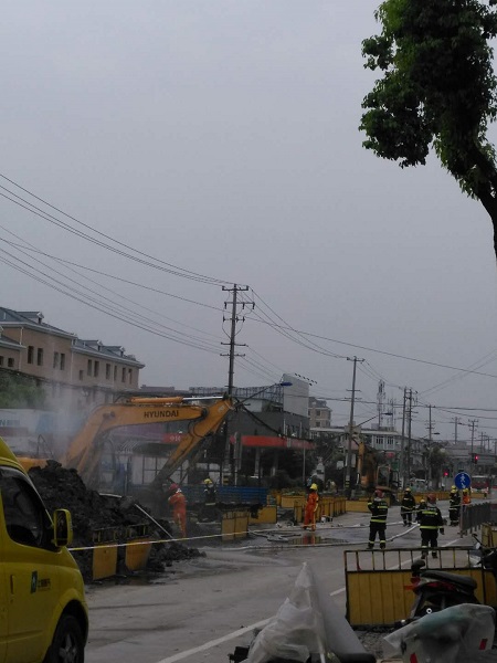 據(jù)附近市民介紹,近期,國權(quán)北路正在進(jìn)行道路施工。昨天下午,一臺挖掘機(jī)在作業(yè)時(shí),不慎將地下一根燃?xì)夤艿劳跀?,頓時(shí),大量氣體從管道內(nèi)噴出,空氣中還彌漫著一股濃烈的煤氣味。目擊者稱,管道被挖破后,現(xiàn)場噴出白色氣體,并不斷發(fā)出“嗤嗤”的聲音,工人們見狀,趕緊將挖掘機(jī)熄火。