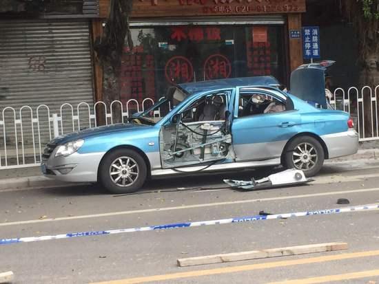 現(xiàn)場出租車車頂被震翻,一側(cè)車門被震落。