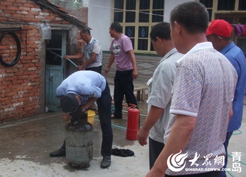 7月25日13時(shí),黃島公安分局理務(wù)關(guān)派出所接到群眾報(bào)警,村民曲大娘在廚房給老伴煮綠豆湯時(shí)煤氣罐突然起火。接警后,理務(wù)關(guān)派出所民警立即趕到現(xiàn)場(chǎng),發(fā)現(xiàn)煤氣罐在西屋廚房?jī)?nèi),煤氣罐軟管接口脫落,接口處正在噴火,并且已經(jīng)引燃了附近的桌子,十分危險(xiǎn)。民警迅速靠近火勢(shì)區(qū)域,頂著濃煙先將煤氣閥關(guān)閉,然后和附近群眾一起利用滅火器對(duì)廚房?jī)?nèi)可燃物進(jìn)行噴灑,并用打濕的衣物蓋在液化氣罐上對(duì)罐體進(jìn)行冷卻,成功化解了險(xiǎn)情。此時(shí),曲大娘懸著的心也放了下來。
